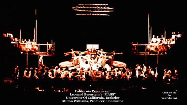 Milton Williams conducted his U.C. Berkeley students, professional vocal soloists, professional dancers, and Oakland Symphony, with Norbert Vesak of the Metropolitan Opera and Stuttgart Ballet as Director and Choreographer. He was also the Associate Conductor for the Vatican’s production of “MASS,” and performed as an Ensemble singer, Bass Soloist, and Narrator for the Carnegie Hall presentation of Leonard Bernstein’s Theatre Piece for Singers, Players, and Dancers, “MASS,” Robert Bass Conductor.